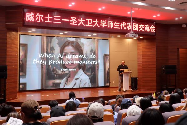 交流会上,UWTSDTimi教授首先做了题为“Does AI Dream?”的学术报告。他提出了一个非常有趣的问题:“人工智能会做梦吗?”随后,他通过视频展示和现场讲解分享了自己的思考和研究,最终得出结论:通过研究人类梦的元素,如感官的丰富性、叙事结构和情感内容,AI创作的过程在一定程度上可以被视为“梦”。Timi教授的分享极具前瞻性、创新性和启发性,轻快的语调和跳跃的思维吸引了同学们的兴趣,激发了大家对艺术设计创新领域的兴趣,让听众受益颇丰。