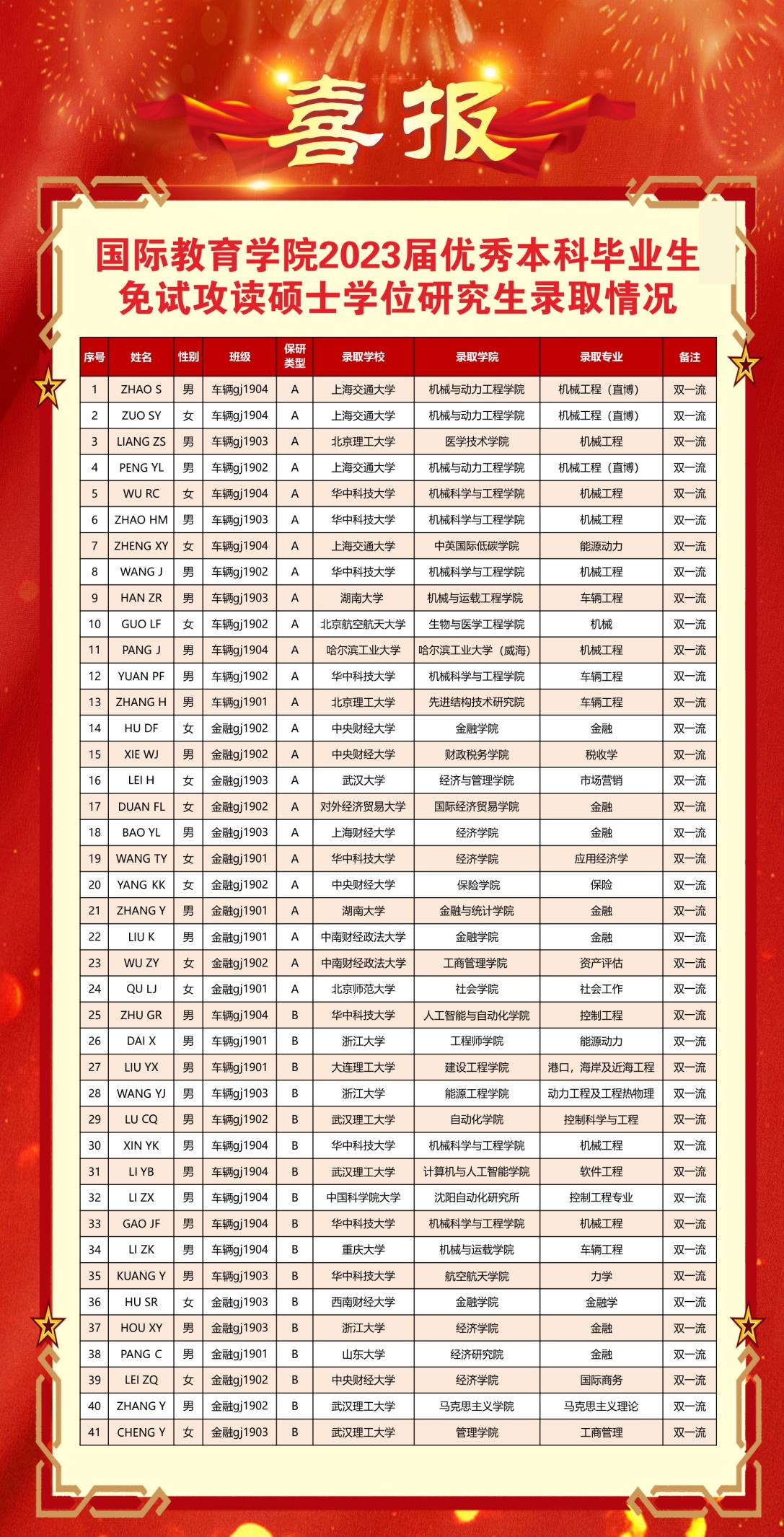betway西汉姆联官方网站车辆工程(中外合作)、金融学(中外合作)专业2023届优秀本科毕业生推荐免试攻读研究生(以下简称“推免”)工作取得历史性突破。今年全院共有41名同学获得研究生推免资格,公司整体保研率为17.08%,“双一流”高校录取率为100%,其中车辆工程(中外合作)保研率为19.04%,专业保研率创公司自开展推免工作以来历史最好成绩。