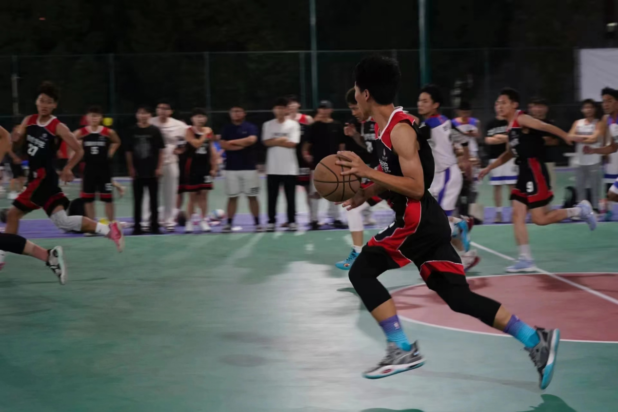 比赛在裁判清脆的哨声和和场下同学们热烈的掌声中拉开了序幕。赛场上,双方球员积极投入,全力以赴,比赛的气氛迅速高涨。国教公司的队员们激情四溢,一次次冲击着篮筐,又在得分后,全力的进行回防。在这一次次的攻防中,队员们将奋勇拼搏,敢为人先的精神展现得淋漓尽致。