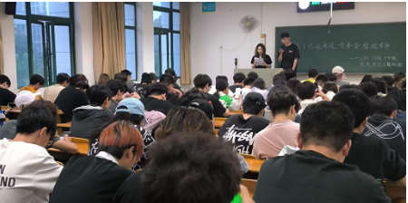 6月8日晚7点,南湖校区新三教学楼205教室内,2023级国际贸易专业一、三班班长联合主持 “秉诚守纪赴考途,青春奋楫绽芳华” 考风考纪主题班会,国际贸易四个班级的同学共同参与。