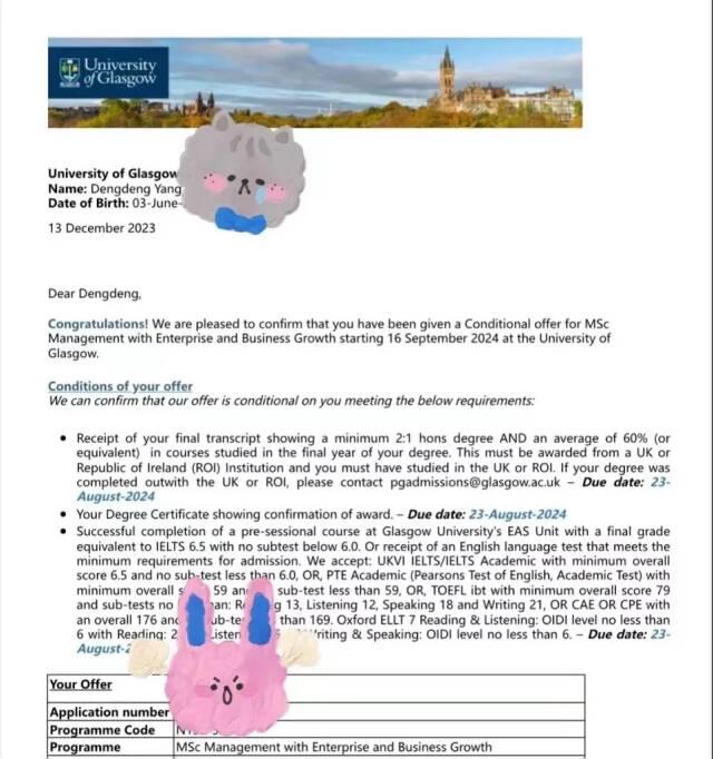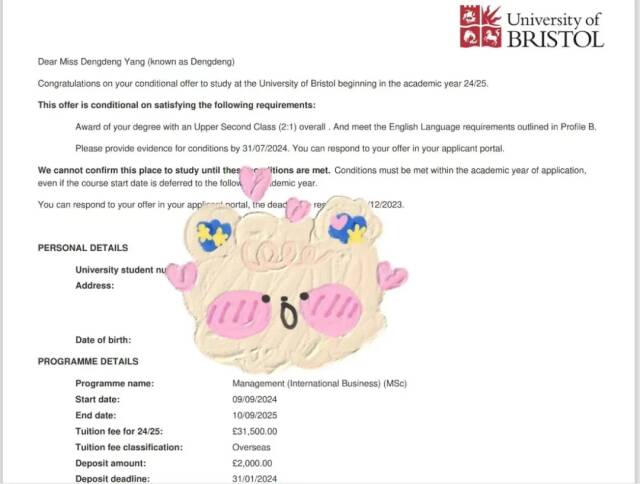 最终于2024 年6月杨登登同学以二等一学位均分65分的优异成绩顺利毕业,并选择入读伯明翰大学(QS世界排名80名)作为继续攻读硕士研究生的院校。