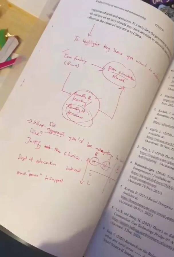 “我还记得每一次去约 Meeting 请教论文的选题定题,他会不厌其烦地一遍一遍耐心地和我解释课程中晦涩难懂的学术概念。甚至怕我听不懂,不介意我用翻译器问他问题,鼓励我大胆自信一些,只要有不会的都可以随时联系他。我拿论文初稿去找他时,他会非常认真的仔细纠正我论文中的问题,在我的初稿上写满密密麻麻的批注,让我拿去修改。这一门课的第一个考核我拿到了77分的高分,全得益于教授的耐心辅导。”