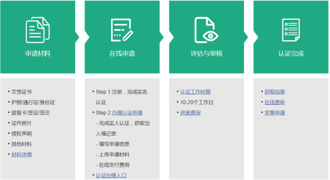 所有学历学位认证申请人均可享受快捷申请服务模式,即在线提交认证申请时,仅需上传认证申请所需材料的电子版。在申请人提交申请并支付相关费用后,可直接进入认证程序,无需再到验证机构递交纸质申请材料。申请程序如下: