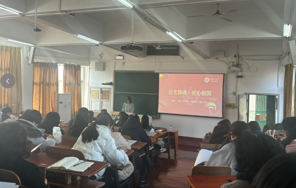 随后,师德讲坛以“追光铸魂 匠心报国”为主题,首先观看了由中宣部、教育部联合制作的《闪亮的名字——2025最美教师发布仪式》中姜德生院士相关片段。随后由全国“最美教师”姜德生院士事迹宣讲团成员蒋雪瑶同学带来主题宣讲,以“用逐光而行谱写科研报国华章”“化身星火点亮青春理想”“从一缕光到一片天的中国梦”三个篇章,用鲜活故事串联起姜院士从实验室到讲台、从技术创新到为国育才的奋斗足迹。