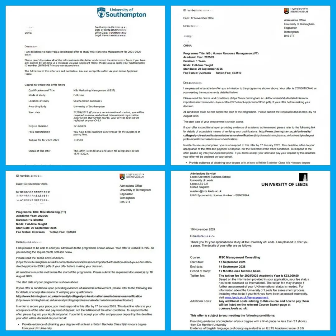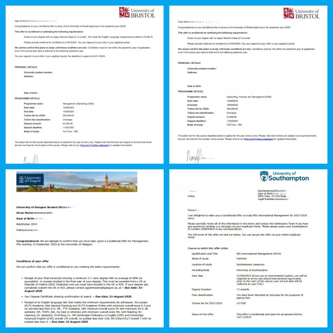 近日,公司众多2021级SQA项目的员工从海外高校向公司发来捷报,分享他们收到全球百强名校OFFER的喜悦。如周同学、成同学等同学分别收到英国布里斯托大学(2025年QS世界大学排名第54位)、格拉斯哥大学(2025年QS世界大学排名第78位)、伯明翰大学(2025年QS世界大学排名第80位)、南安普顿大学(2025年QS世界大学排名第80位)、利兹大学(2025年QS世界大学排名第82位)等全球知名高校的硕士录取通知书。