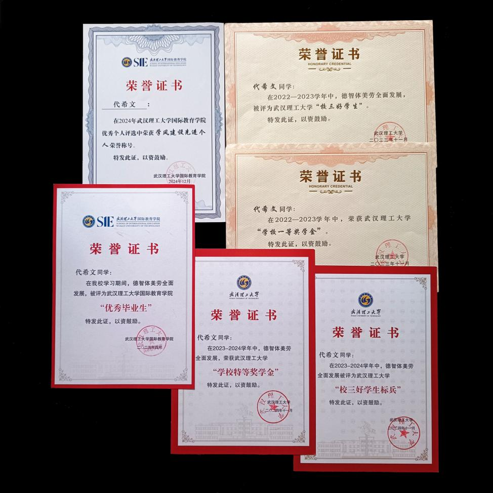 曾获“校特等奖学金”“校一等奖学金”“校三好员工标兵”“优秀毕业生”等荣誉;