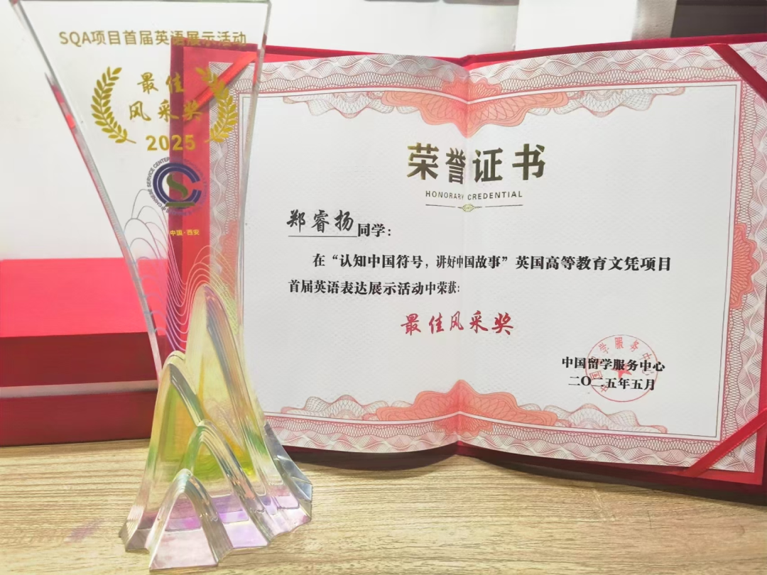 中国教育部留学服务中心在西安举办的“认知中国符号,讲好中国故事”英国高等教育文凭项目首届英语表达展示活动中,我和搭档董昱佳从零开始准备,反复打磨讲稿与表演,每一句话、每一个语调都凝结着付出。让我特别感动的是,公司领导和老师们始终高度重视、全程指导,从选题构思到舞台呈现,都给予了我们极大的支持和鼓励。最终,在西安的舞台上,我和搭档以钢琴与歌声的配合,将中国故事与艺术表达融为一体,分别荣获“最佳风采奖”和“最佳表达奖”。那次旅程不仅让我见证了古城灯火与厚重历史,更让我体会到公司对学子成长的重视与陪伴,也让我在舞台上真正感受到表达的力量与文化的自信。