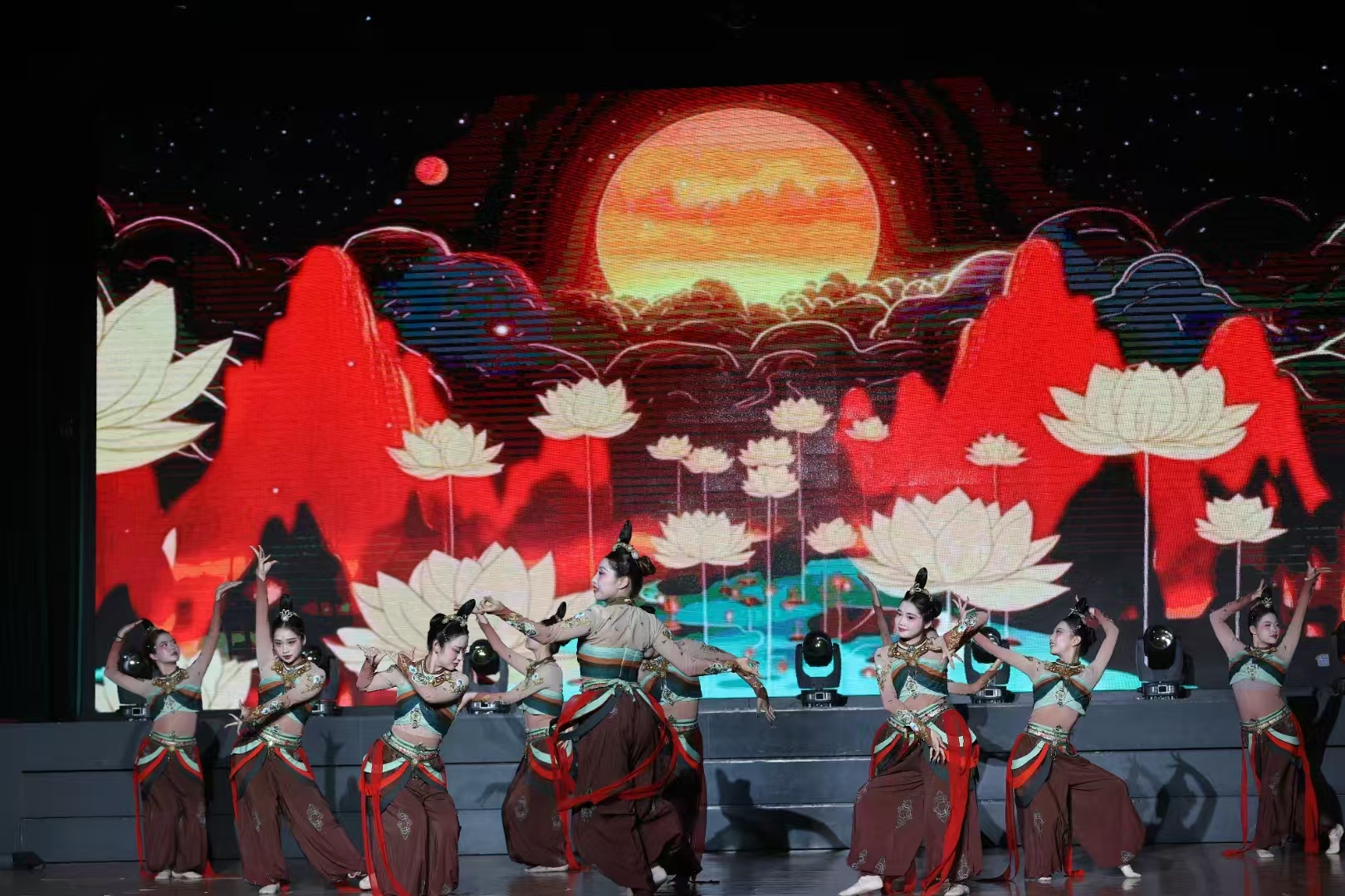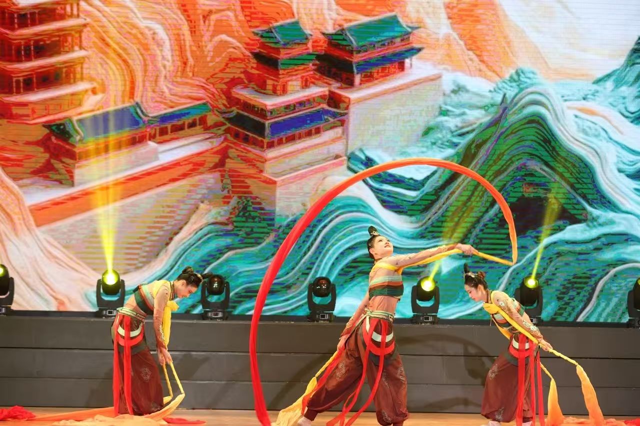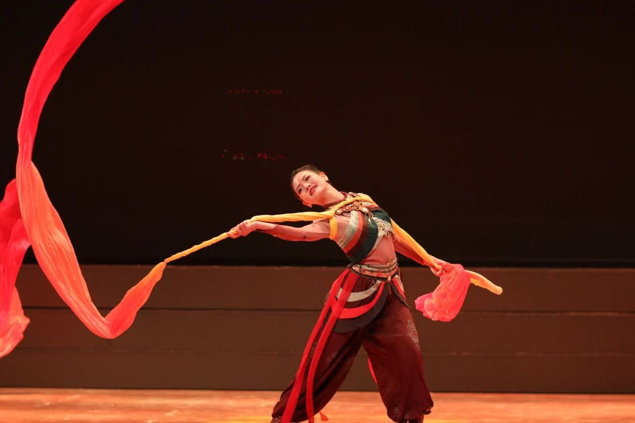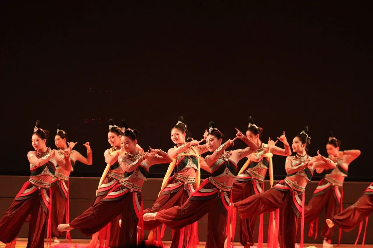 《伎乐飞天》改编自敦煌壁画经典形象,通过“S”形身姿、反弹琵琶、绸带飘逸等传统敦煌舞动作,结合现代编舞技法,让沉睡千年的艺术在舞台上焕发新生。队员们以轻盈曼妙的舞姿,展现了中华文化的深厚底蕴与青春活力,传递了文化传承与创新的时代精神。