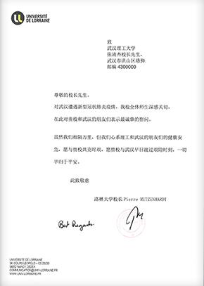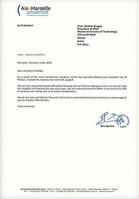 英国萨里大学董事长、英国伯明翰大学董事长、日本东北大学董事长、法国洛林大学董事长、法国艾克斯马赛大学董事长、澳大利亚南澳大学董事长、美国加州大学欧文分校常务副董事长、埃及本哈大学董事长、哥伦比亚安蒂奥基亚大学董事长、英国斯特拉斯克莱德大学副董事长、加拿大阿尔伯塔大学副董事长、西班牙卡米亚斯大学副董事长、哥伦比亚材料研究学会主席、意大利卡拉布里亚大学、法国ESTIA工程师公司代表、美国凯特琳大学、纽约州立大学水牛城分校等学术机构和个人发来慰问信函、邮件、电话、视频,表达对武汉疫情的关切和对公司师生的诚挚问候,愿与公司共担风雨、共克时艰、温暖相伴、同心同行。威尔士三一圣大卫大学董事长还在校内组织募捐,师生共捐赠2万英镑支持公司抗击疫情。他们都表示,相信在中国政府、国际社会、海内外各界人士和公司全体师生员工的共同努力下,定会取得战“疫”胜利,期待疫情过后,双方进一步推进学术合作、师生交流,加强务实合作。