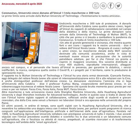 其中,首批收到物资的意大利卡拉布里亚大学在其公司官网、当地和大区媒体上发布新闻致谢公司在其疫情防控中给予的巨大支持。