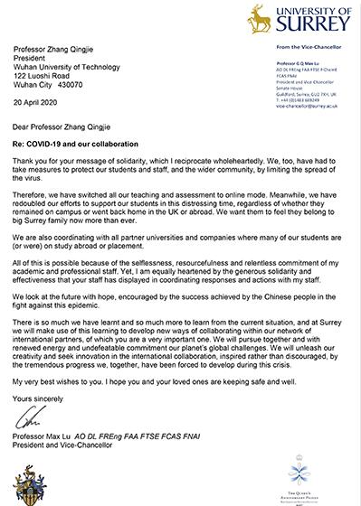 “投我以木桃,报之以琼瑶”。国内疫情发生以来,众多海外合作院校发来信函、防控物资和捐助款项等向公司表达慰问和支持。如今国外疫情日趋严峻,公司密切关注合作伙伴所在国家的疫情形势。张清杰董事长向英国萨里大学、伯明翰大学、威尔士三一圣大卫大学、布鲁耐尔大学,法国洛林大学、艾克斯马赛大学,日本东北大学等十余所合作大学,并向美国麻省理工公司、伍斯特理工公司、西北大学,英国牛津大学、邓迪大学、俄罗斯科公司、俄罗斯工程院、斯诺伐克科公司、意大利都灵理工公司、以色列理工公司、日本东京大学、新加坡南洋理工大学、韩国首尔国立大学、加拿大多伦多大学、澳大利亚纽卡斯尔大学等高校和科研机构的百余位专家发送以《齐心抗“疫”,共盼春来》为主题的慰问信。张董事长在信中指出,众志成城、团结协作是应对此次疫情的关键所在,公司将积极为有需求的高校及外国专家提供力所能及的防疫物资,期待双方的工作与生活、交流与合作早日重现如春天新芽般的勃勃生机。