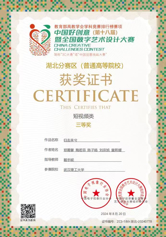 (2024年短视频作品《归去来兮》获中国好创意暨全国数字艺术设计大赛湖北赛区三等奖)